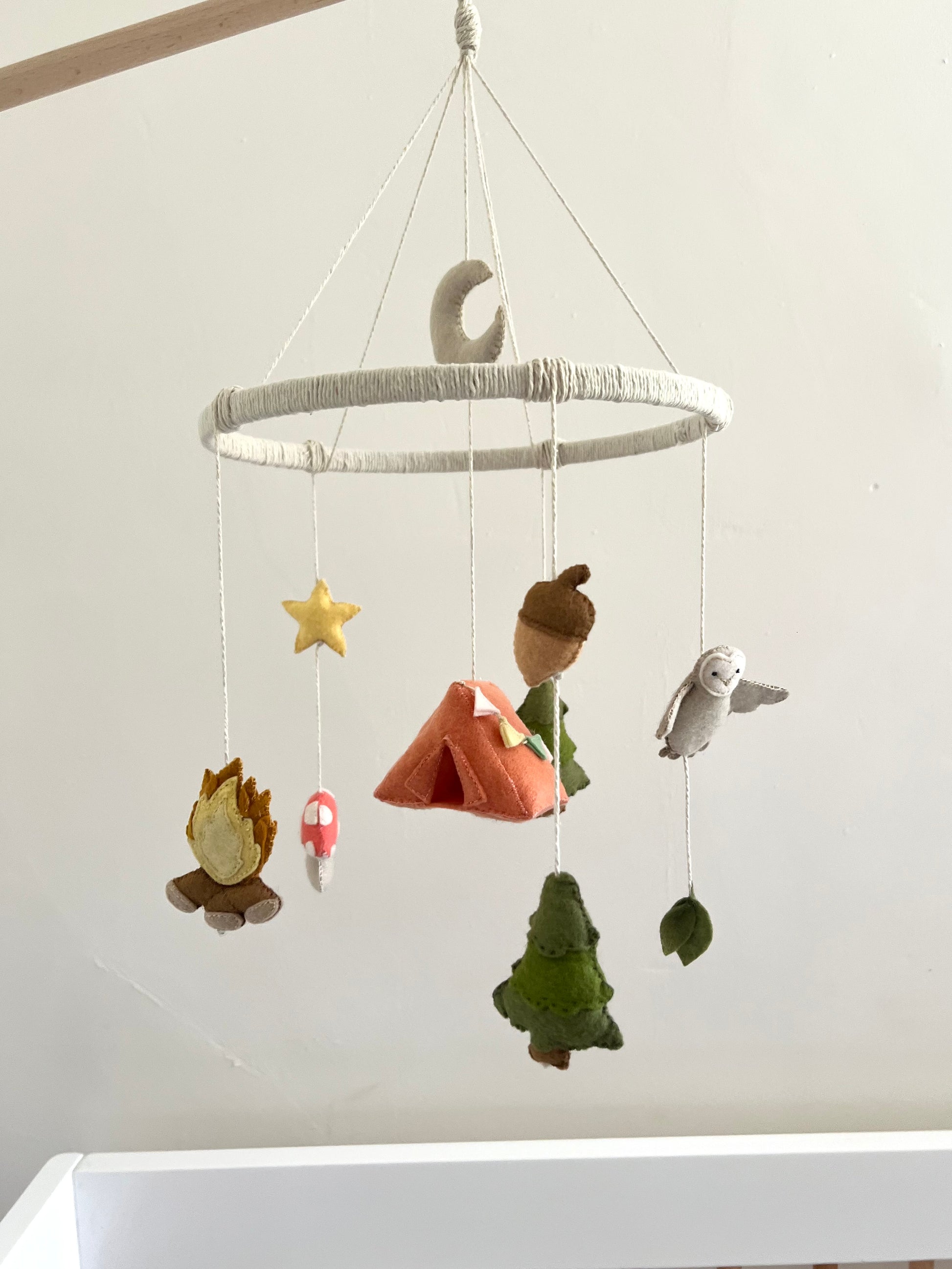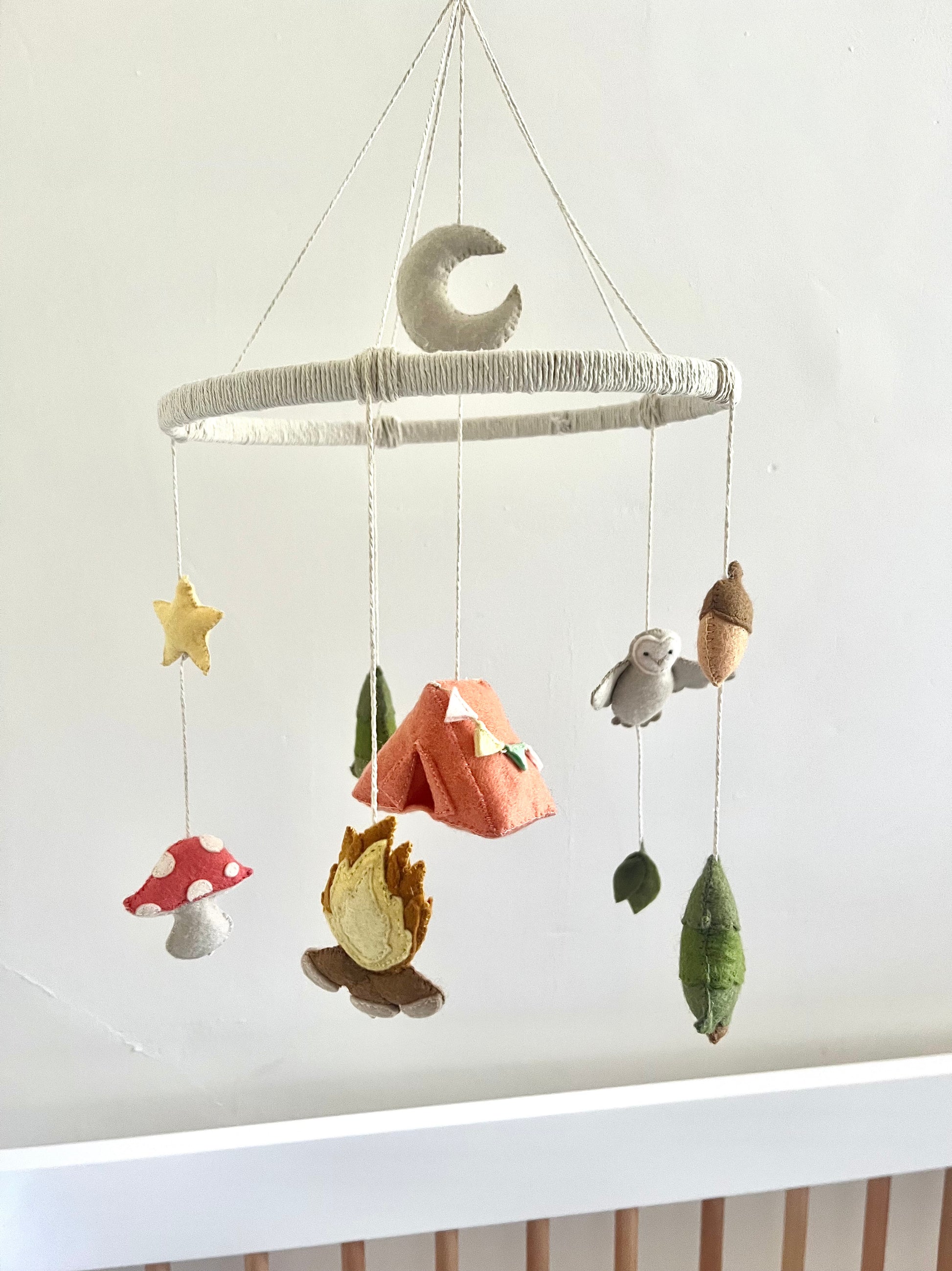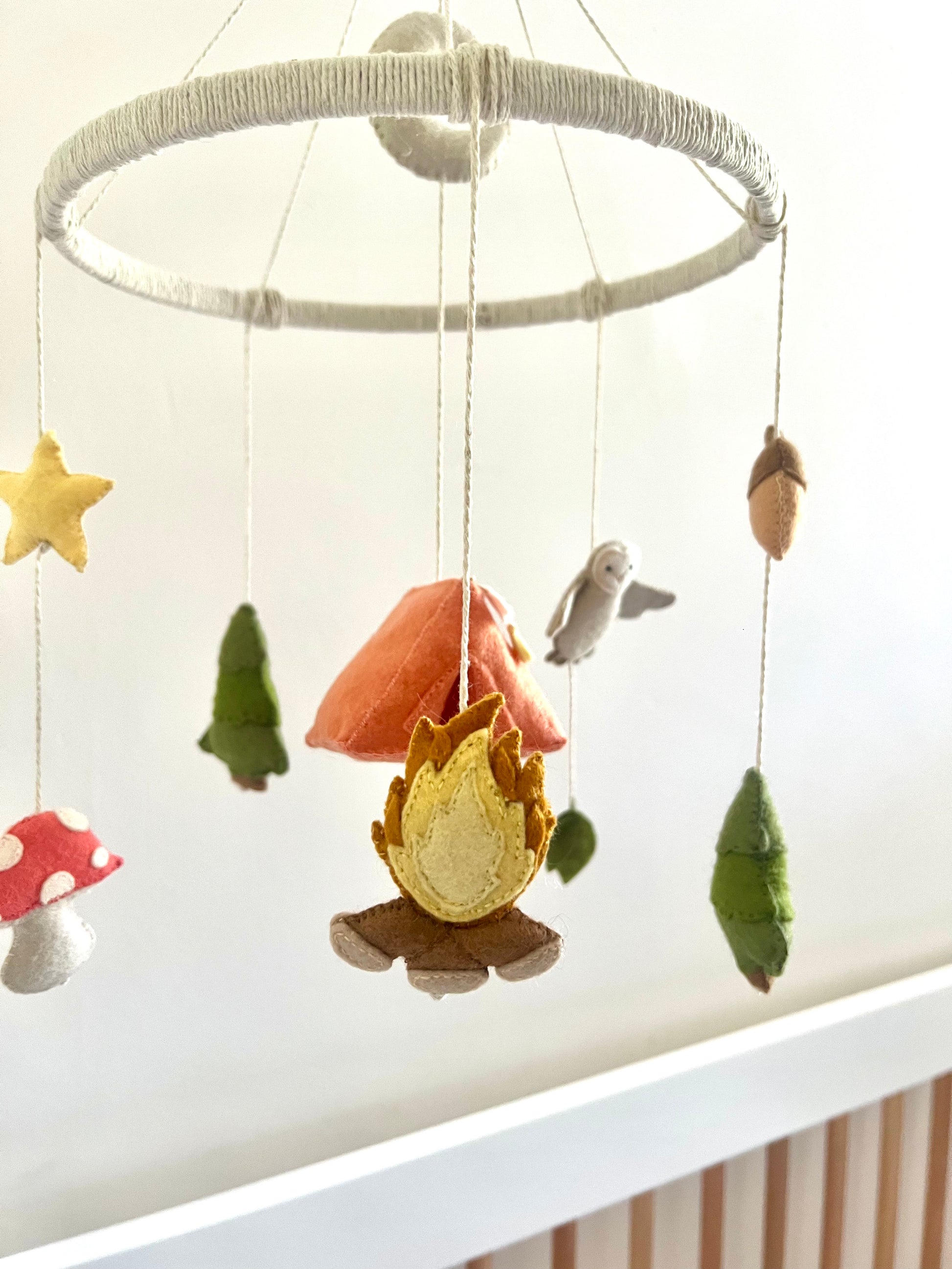 Featuring a 3D tent draped in pastel bunting and a felted forest scene including a swooping owl and crackling fire. This unique baby mobile would be a beautiful addition to any nursery. The soft, gender-neutral palette makes it the perfect baby shower gift, thoughtfully designed to be a treasured keepsake for a new baby.