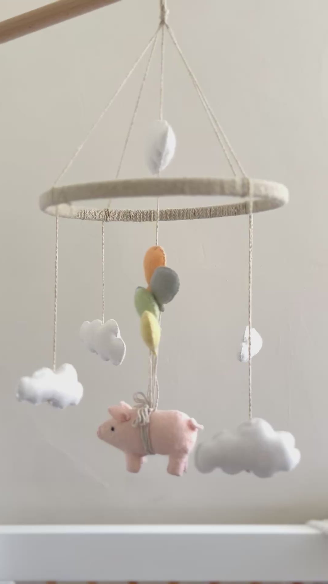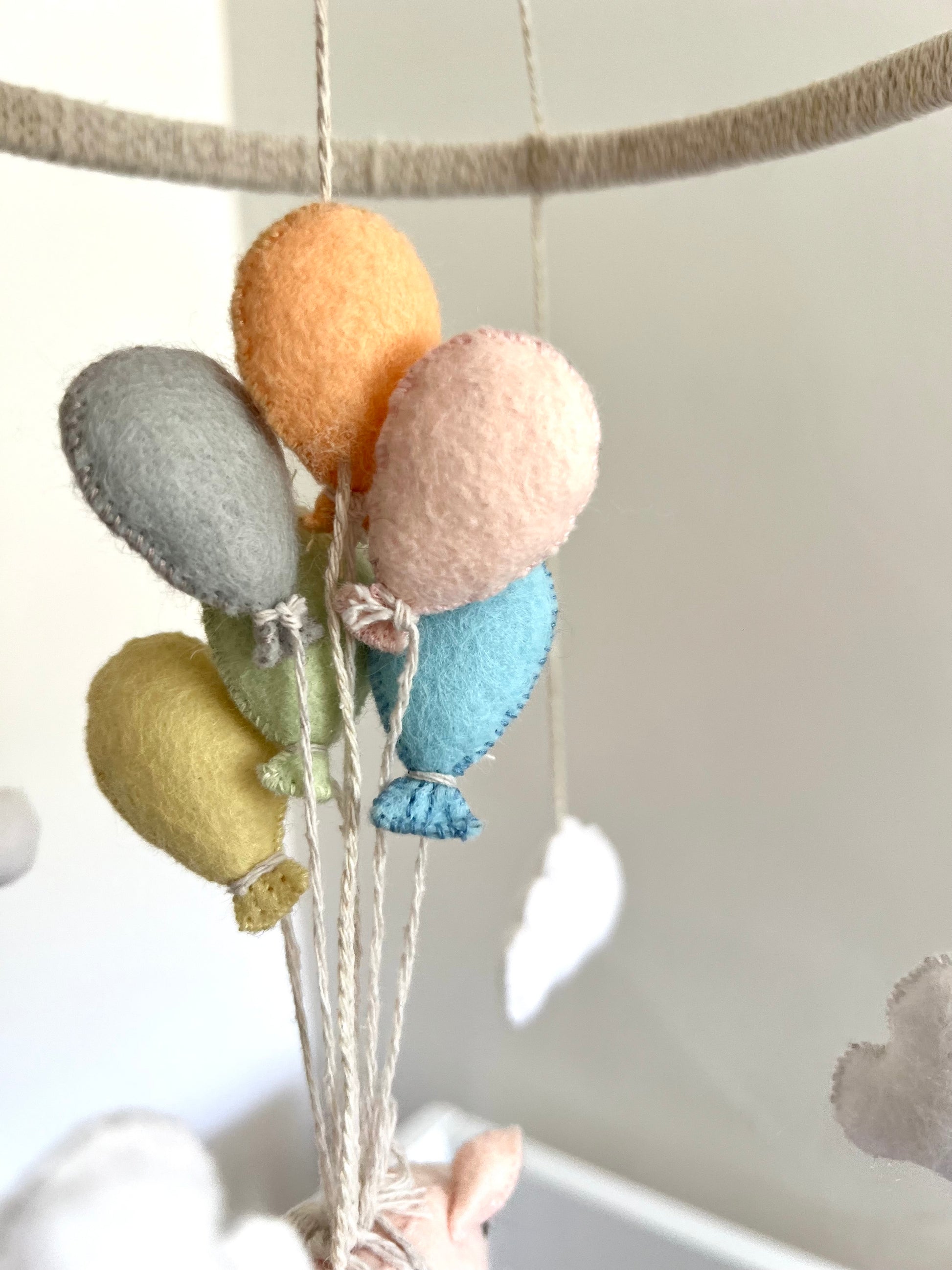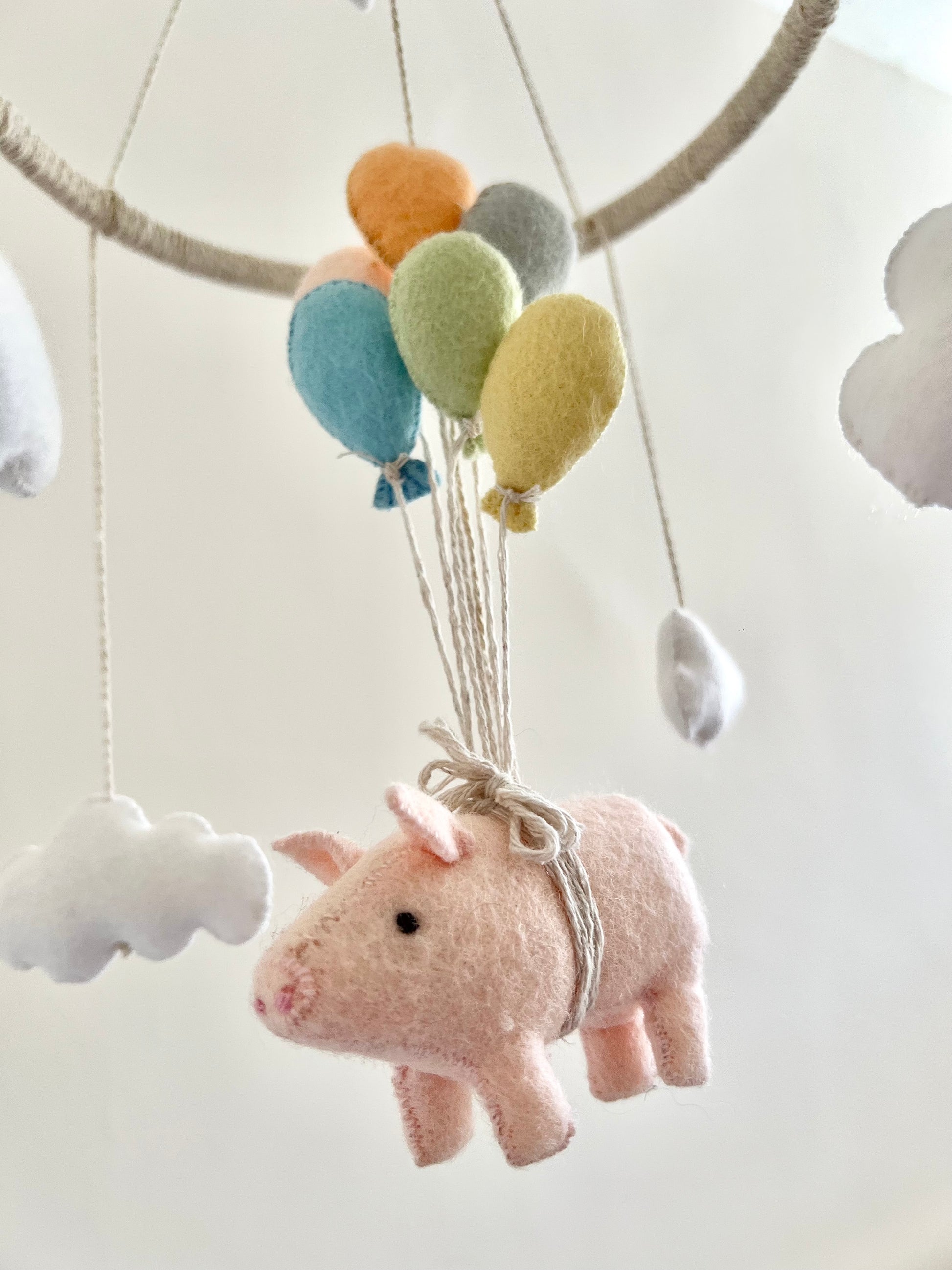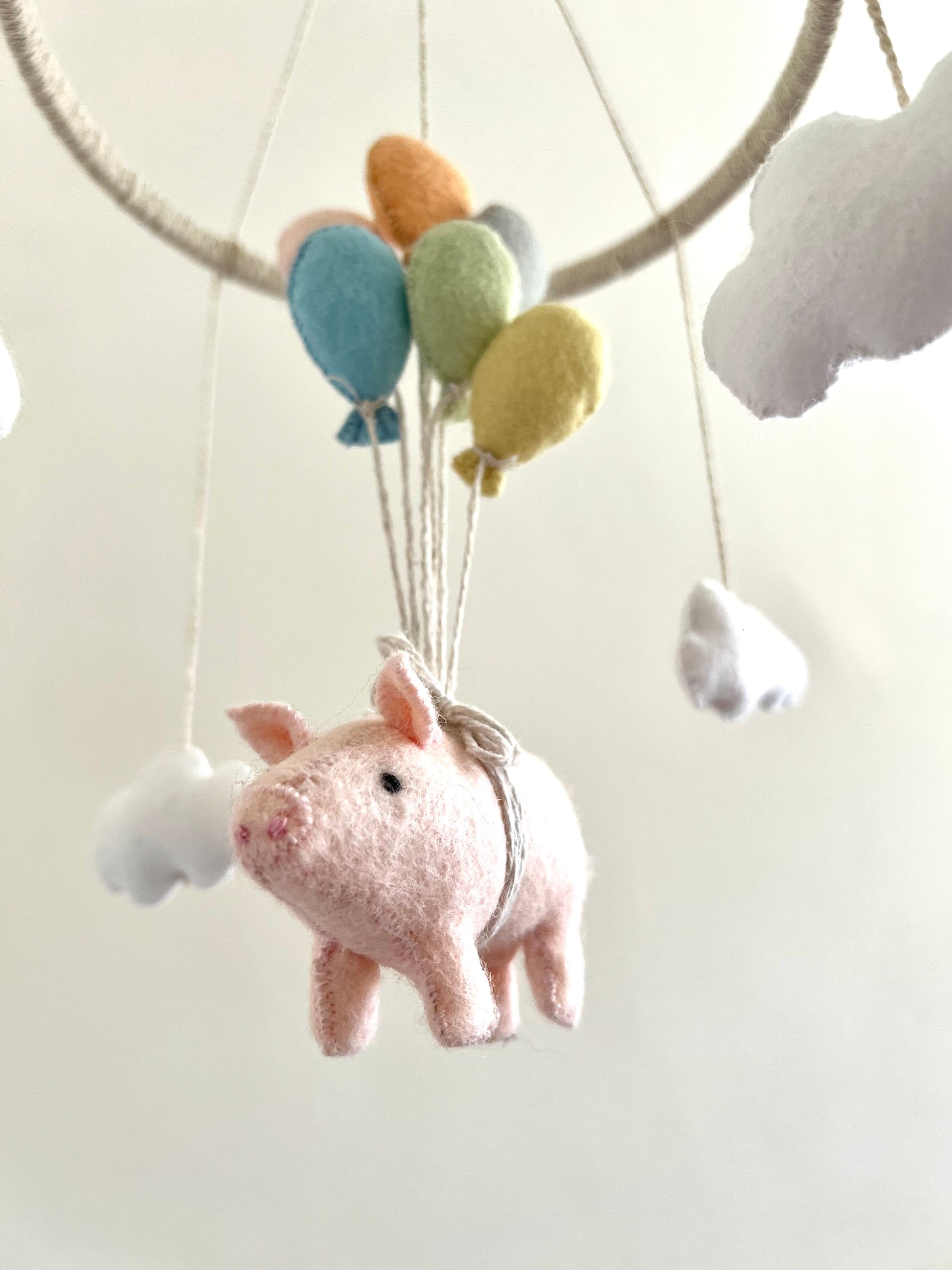 Featuring a little felt piglet drifting through clouds with a bunch of pastel balloons, this unique baby mobile would make a beautiful addition to any nursery. The soft, gender-neutral palette makes it the perfect baby shower gift, thoughtfully designed to be a treasured keepsake for a new baby.